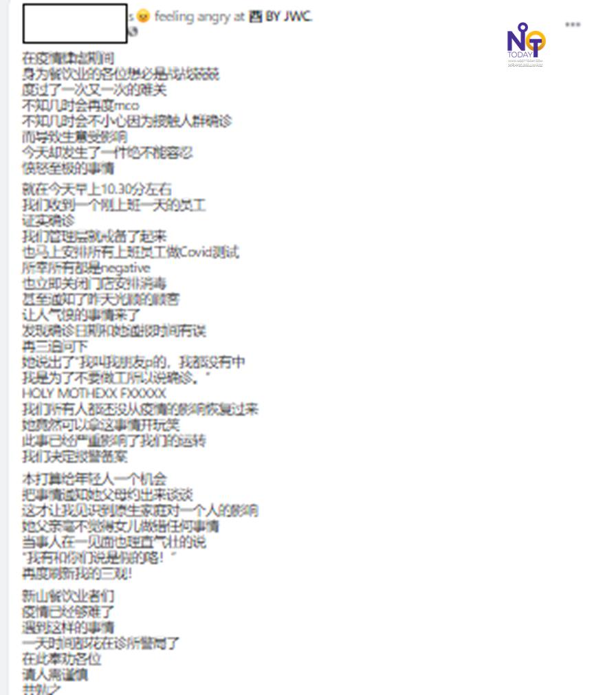 业者在PO文中指出,疫情肆虐期间,餐饮业是咬紧牙关撑过艰难期,即使开店营业后,也提心吊胆担心接触人群确诊后,影响餐厅生意。这起新进女员工为辞职而作出的确诊造假事件,让原本已经是十分艰难的营运,劳民伤财,变得难上加难。
